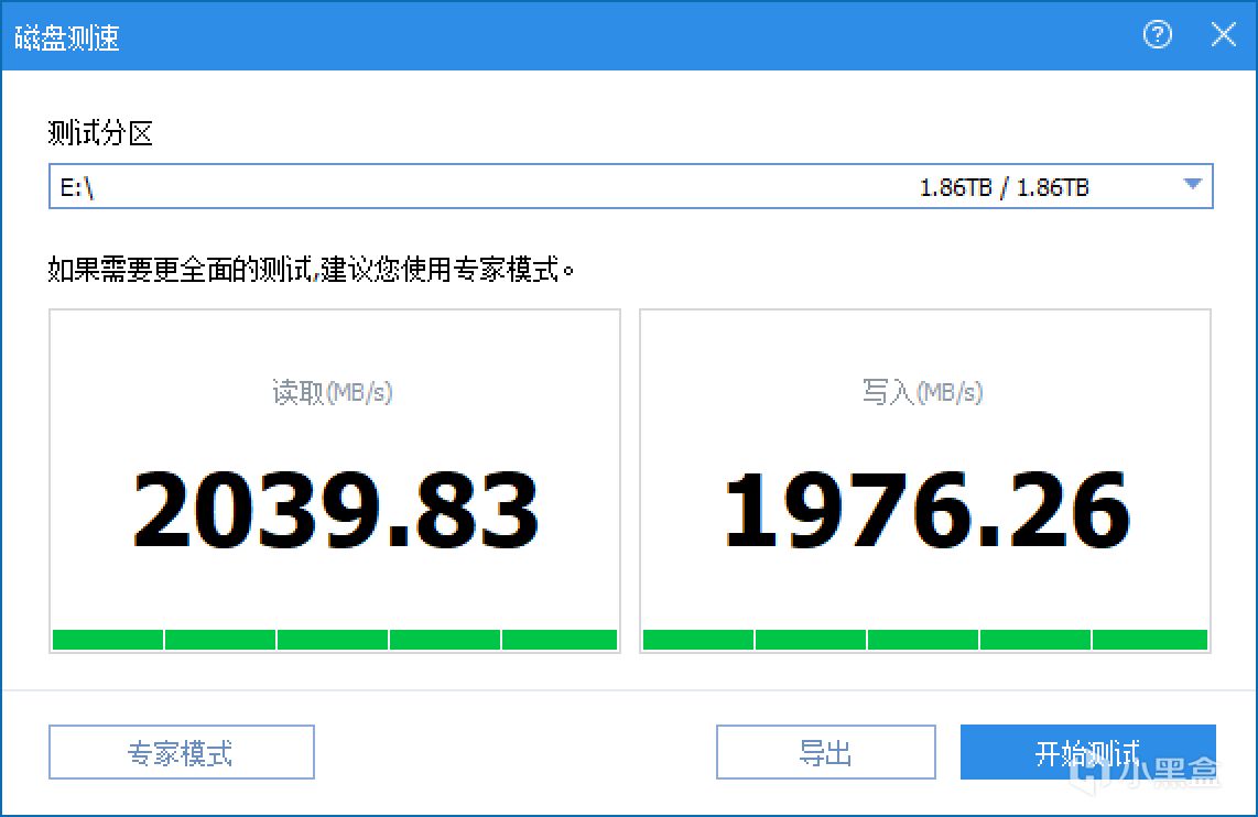 用傲梅分区助手的磁盘测速,可以看到读取速度:2039.83 MB/s,写入速度:1976.26 MB/s。