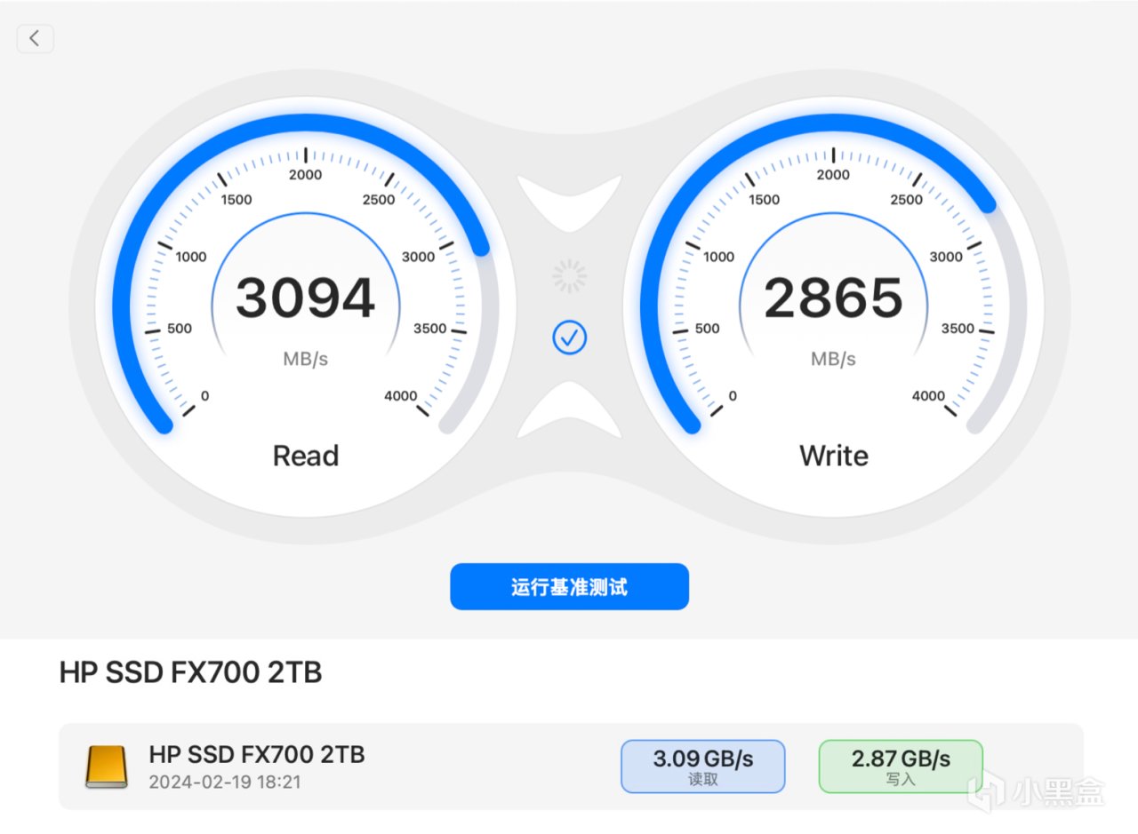 用SENSEI软件测速,连续读取:3094 MB/s(3.09 GB/s),连续写入:2865 MB/s(2.87 GB/s)。