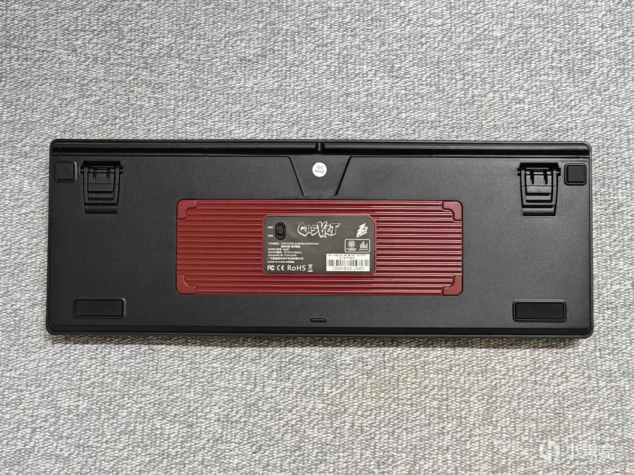 來到背面,背面是紅黑拼色的設計,一共有4處防滑腳墊。腳撐是2段式的,背面還有線材的三向開槽。中間還有一個切換WIN/MAC系統的按鍵。沒錯,居然還支持雙系統,他真的,我哭死!