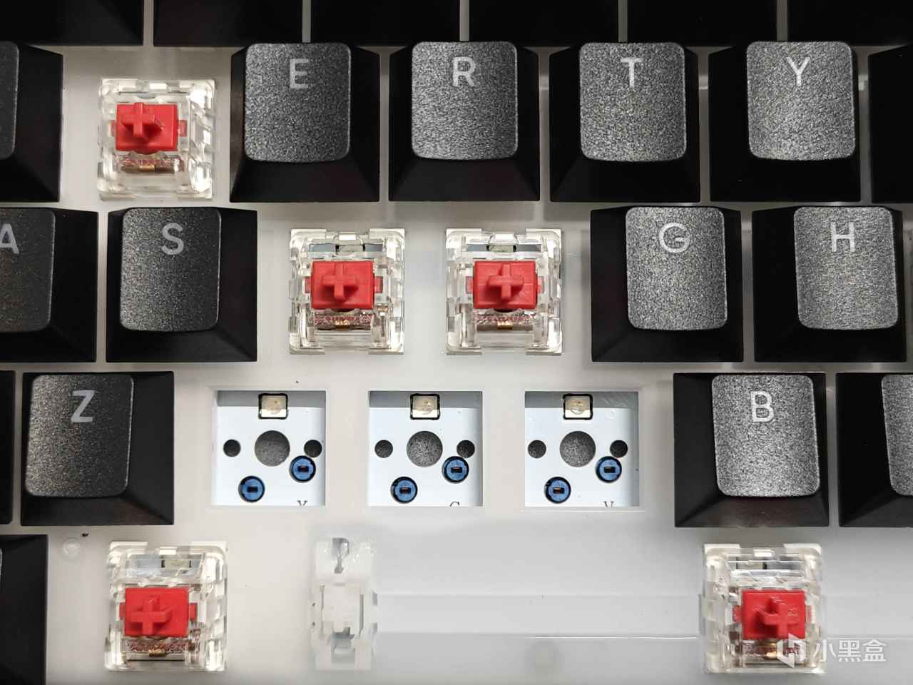 拔出軸體,咱們可以看到下面的結構。首先我們能看到,GA87的燈位是上燈位。定位板是PC材質的,下面有一層EVA夾層消音棉,接着是一層Gasket結構,最後還有一層EVA消音底棉。2層EVA夾層消音棉,能夠過濾大部分雜音,使GA87按鍵聲音更加純粹好聽。