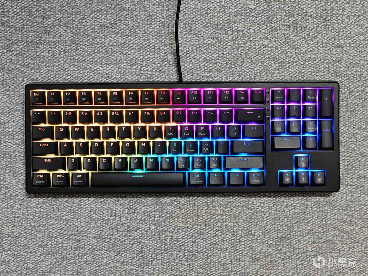 GA87是87鍵配列的單模鍵盤,只支持有線的連接模式。鍵盤一共有3個版本:混光版、RGB版跟熱插拔款。分別都有:青軸、紅軸、茶軸三種軸體可選。但是RGB版本一直都是無貨狀態,騎貓這個鍵盤是黑色的熱插拔款。鍵盤整體是黑色的,鍵帽是雙色印刷的ABS字符透光設計鍵帽,點亮RGB燈之後顏值非常在線。鍵帽是階梯式按鍵佈局,符合人體工學設計。