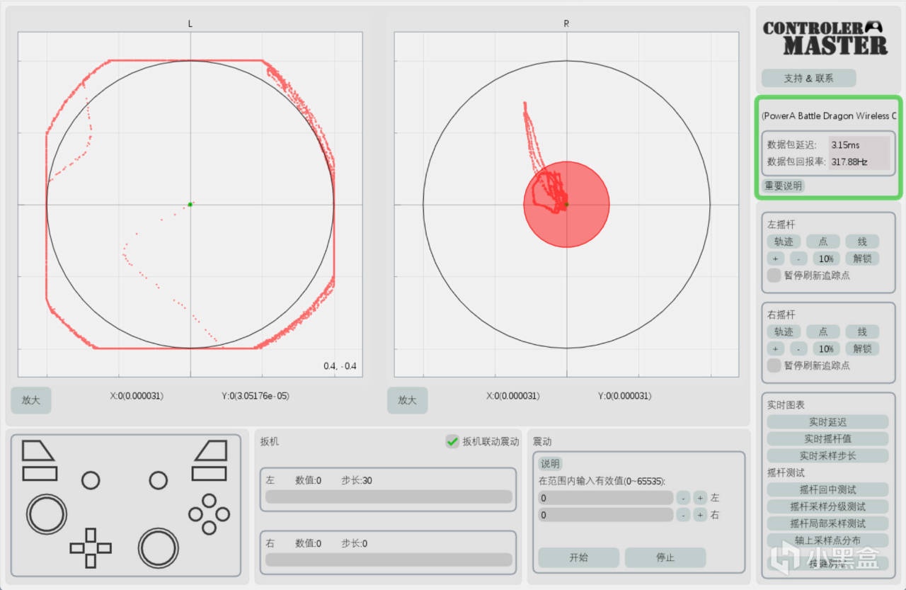 但是需要注意的是个人三个手柄种的一个手柄的摇杆轨迹右上角缺了一块。(需要自行在驱动中优化调整即可修正)