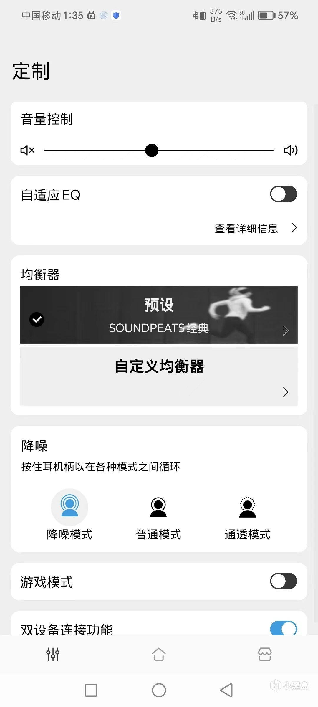 在手机上下载官方APP可以更方便更细致的对耳机进行个性化调整,除了可以进行降噪和通透模式的切换、固件的升级等常规功能外,还可以开启自适应EQ,让耳机逐步了解它的主人,获得专属于你的音乐体验。