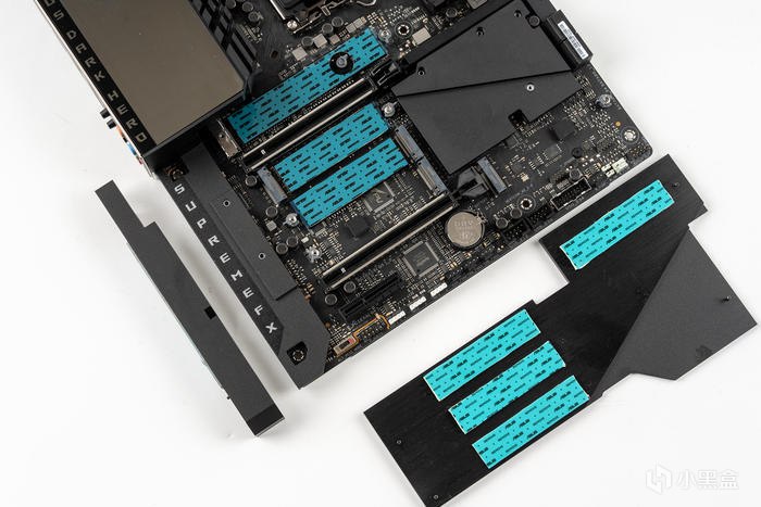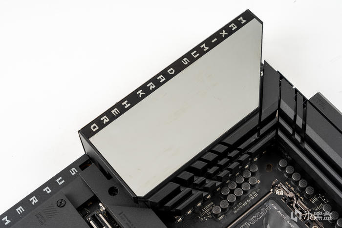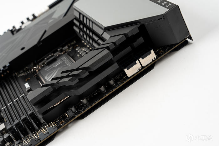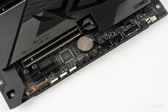 打开M.2散热模块,第一条为非常厚实的方形铝块,用于PCIE5.0 M.2散热,下面散热模块打开有4条PCIE4.0 X4的M.2,而前3条M.2提供了背面散热,相对于上一代Z790HERO需要M.2扩展卡扩展M.2的情况,个人认为主板上集成5条M.2更方便了
