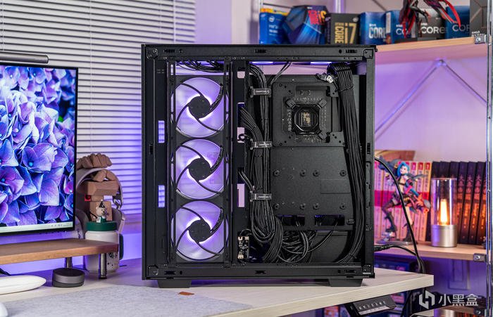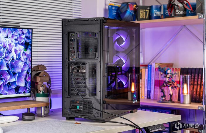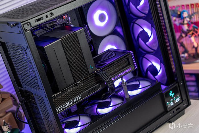 打开侧板,巨无霸的猛禽显卡与双塔双扇的阿萨辛4风冷在整个机箱中也显得小了,标准ATX布局的安装其实是最优化的安装方式