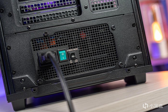 电源的出风口上绿色的电源开关也是九州风神的传统了,旁边的HYBRID MODE按钮为ECO开关,开启后可在低负载下开启风扇停转的FANLESS模式,FDB风扇同样支持PWM温控调节