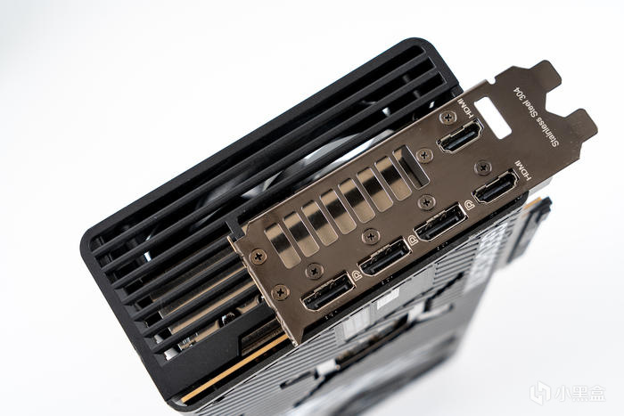 显卡的背板在斜纹下中间有个亮镀色的ROG标,和右边的通风设计