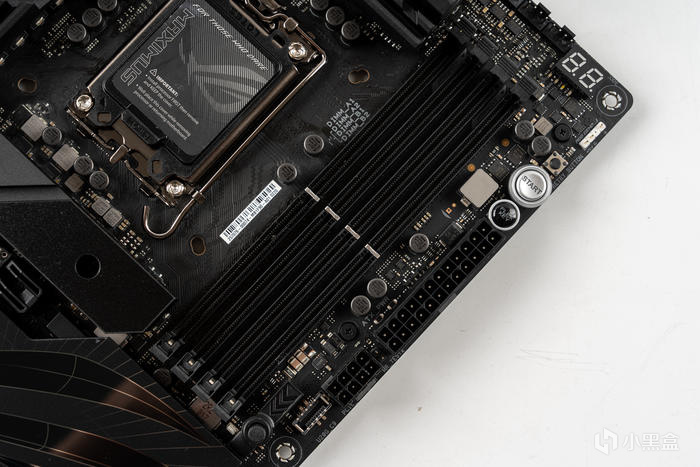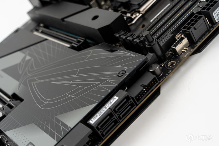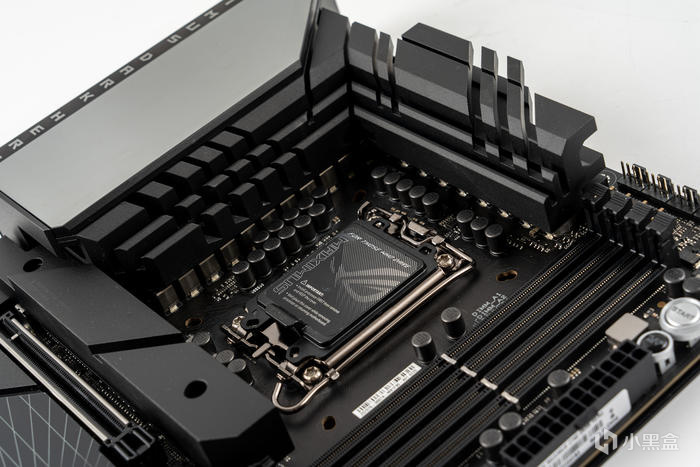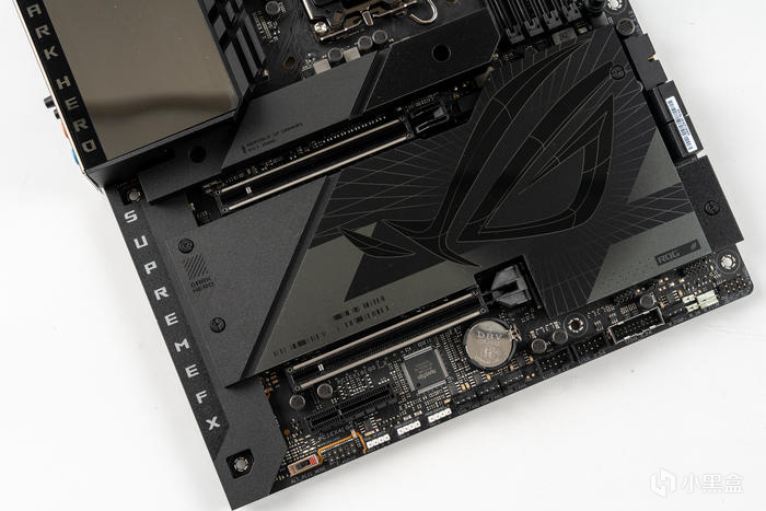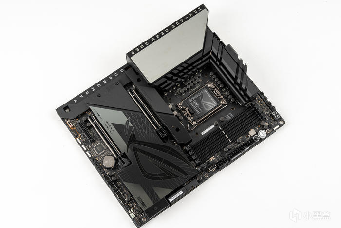 MAXIMUS Z790 DARK HERO的主板本体,标准ATX板型,尺寸为30.5cmx24.4cm;依然是ROG风格,全黑设计,全黑散热,一体IO上盖的镜面效果与ARGB灯效风格,整个主板呈现非常厚重的高端风格