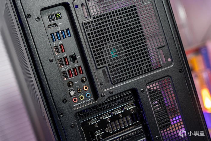 背板右边的通风设计,中间有一个两面设计的ROG大眼睛,其实是整块铝合金背板上面CNC出来的条纹镂空和高低阳刻出来的大眼睛