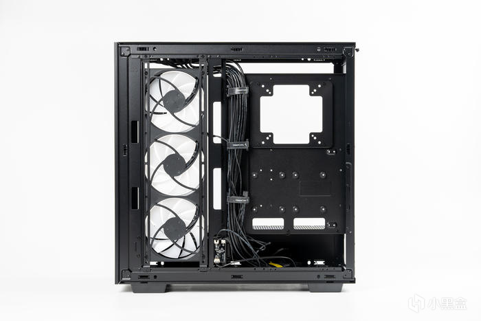 打开背板,内部26mm的理线空间非常富足,标配了多个魔术扎带与理线孔