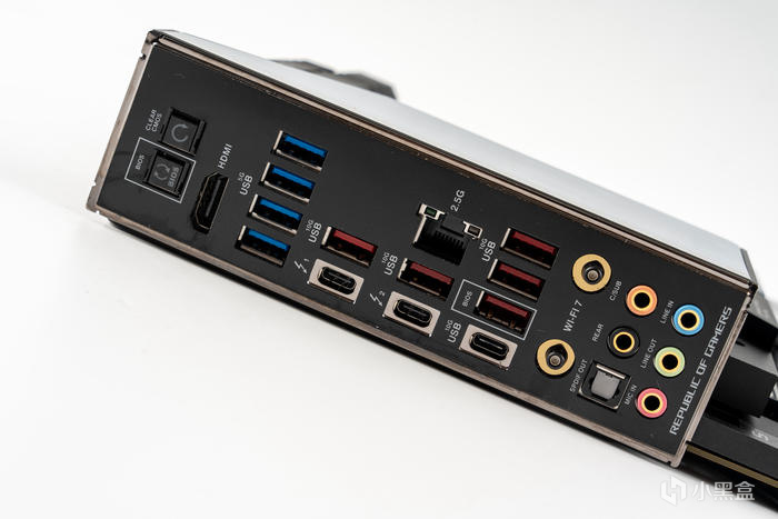 背板的接口布局这里,从左至右依次提供了清除CMOS、BIOS刷写按钮、集显HDMI、四个蓝色USB3.2GEN1、五个红色USB3.2GEN2、两个40G雷电四、一个type-C、2.5G有线和WIFI7无线以及镀金音频接口,其中新的WIFI7采用了新的易插接口设计