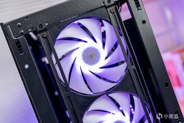 打开侧板,侧板为上碰珠扣下插销设计,顶部的一颗固定螺丝需要拧下才能取,内部主板右侧标配了一把三联一体的140x3风扇,并支持ARGB灯效控制