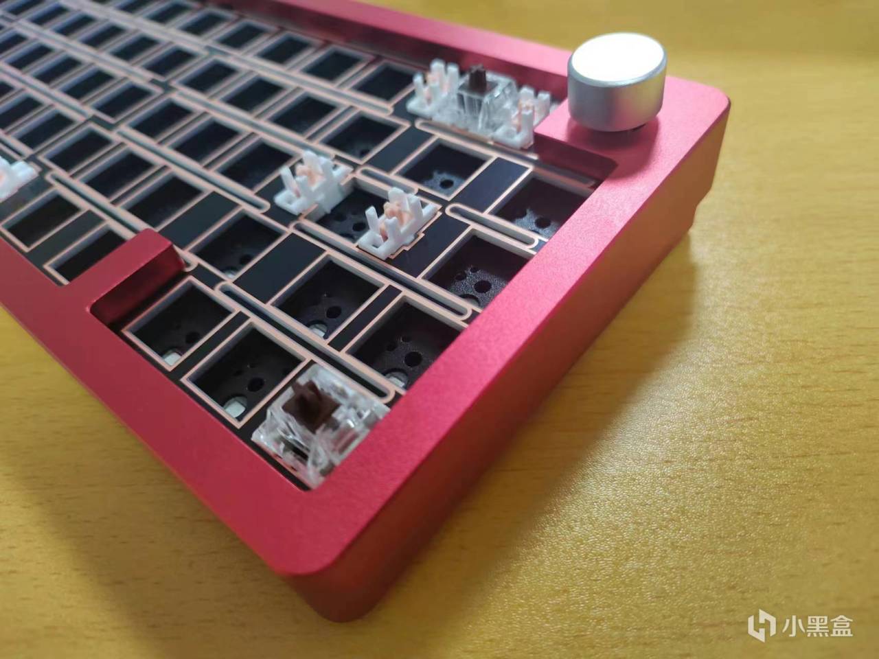 回到本文的主角身上,AL65的套件有雅黑、银白、酒红和樱粉四种配色,我到手的这款是酒红套件+黑桃键帽的组合,套件整体看起来和一般的铝坨坨没什么不同,在四个角上用了棕轴轴体做了固定,当然轴体给的自然是全键的轴体,不会少给这四颗。