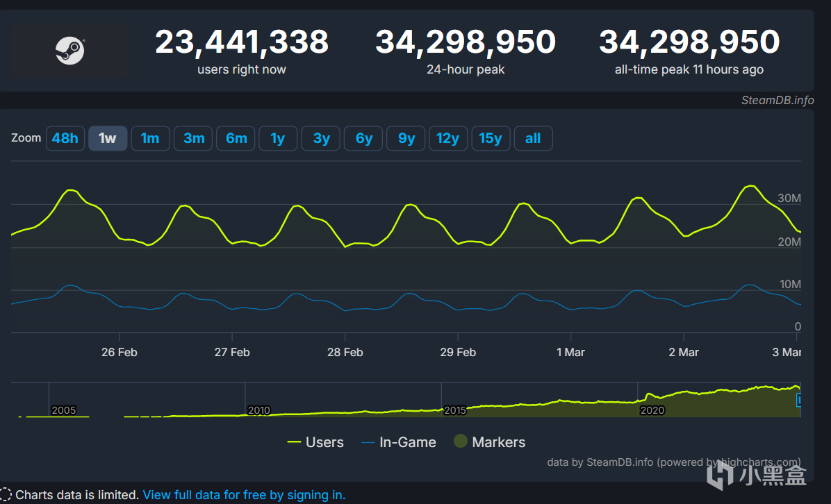根据SteamDB的数据,Steam同时在线峰值创造了新高,达到了34298950人。2024年1月6日时Steam同时在线峰值破3300万(33675229),两个月不到的时间,峰值再创新纪录。