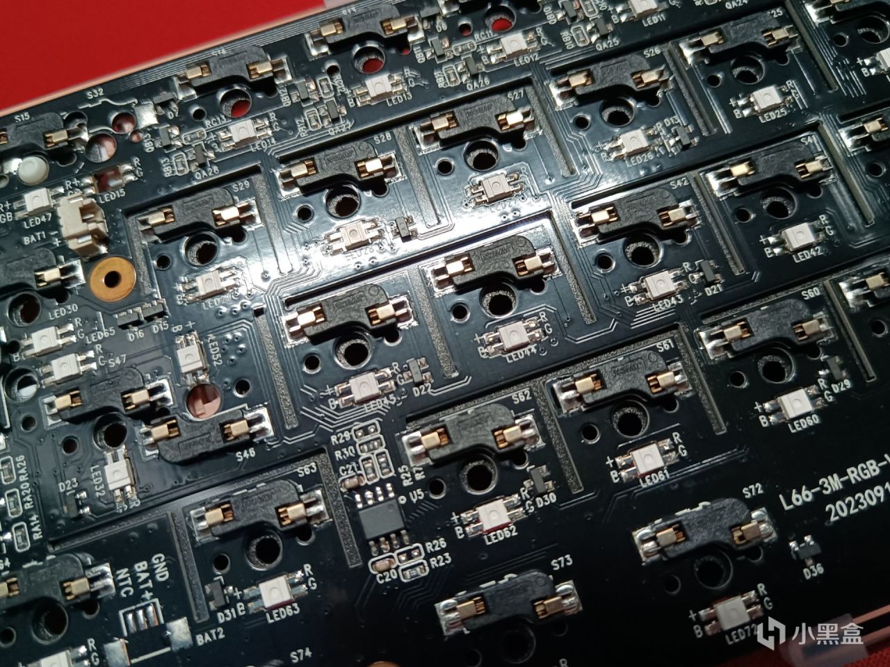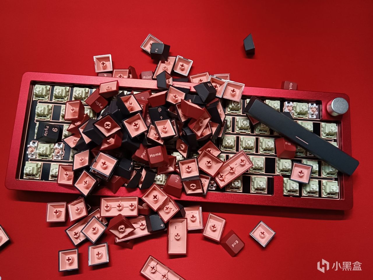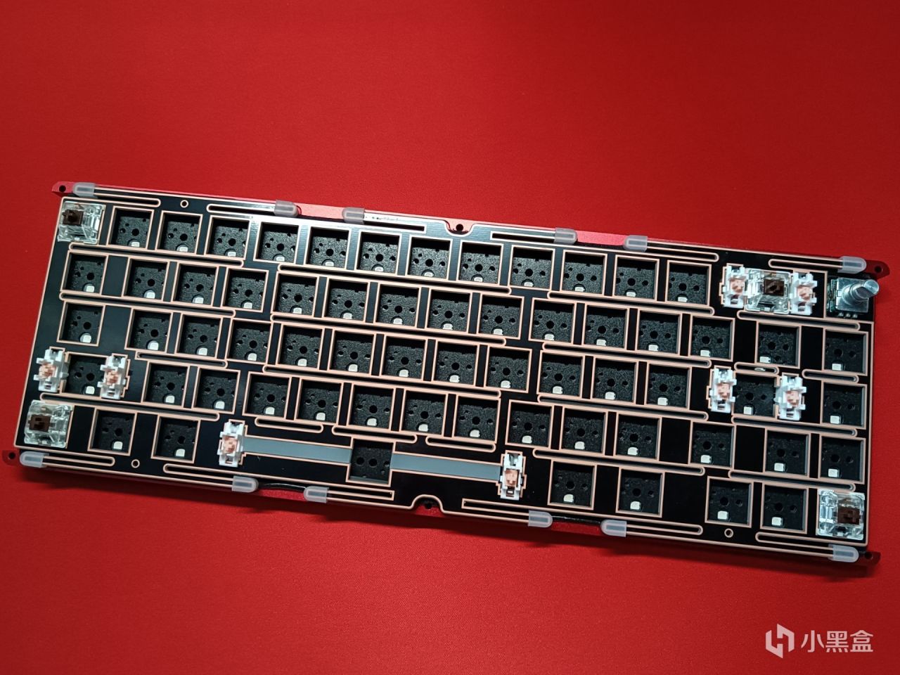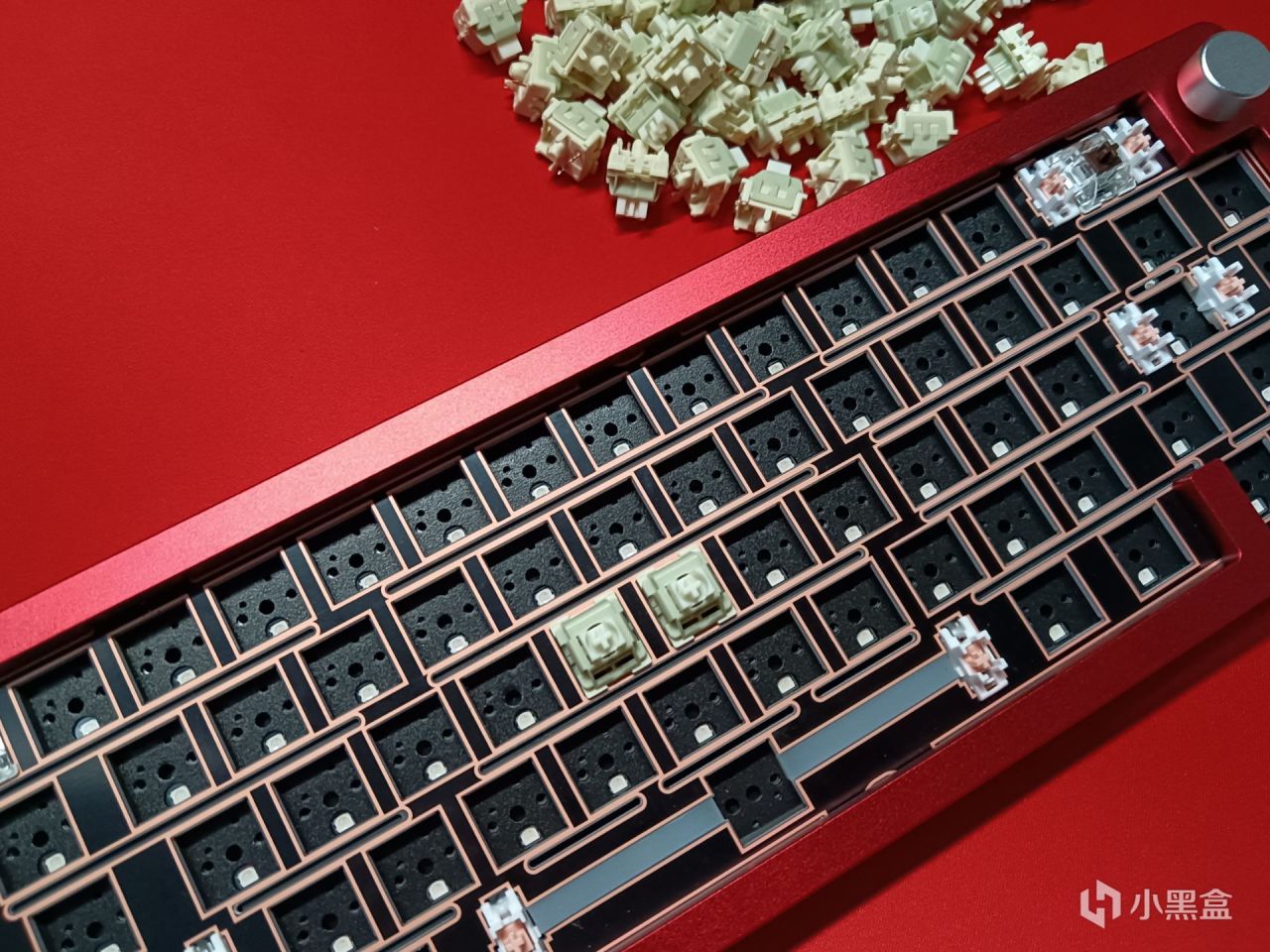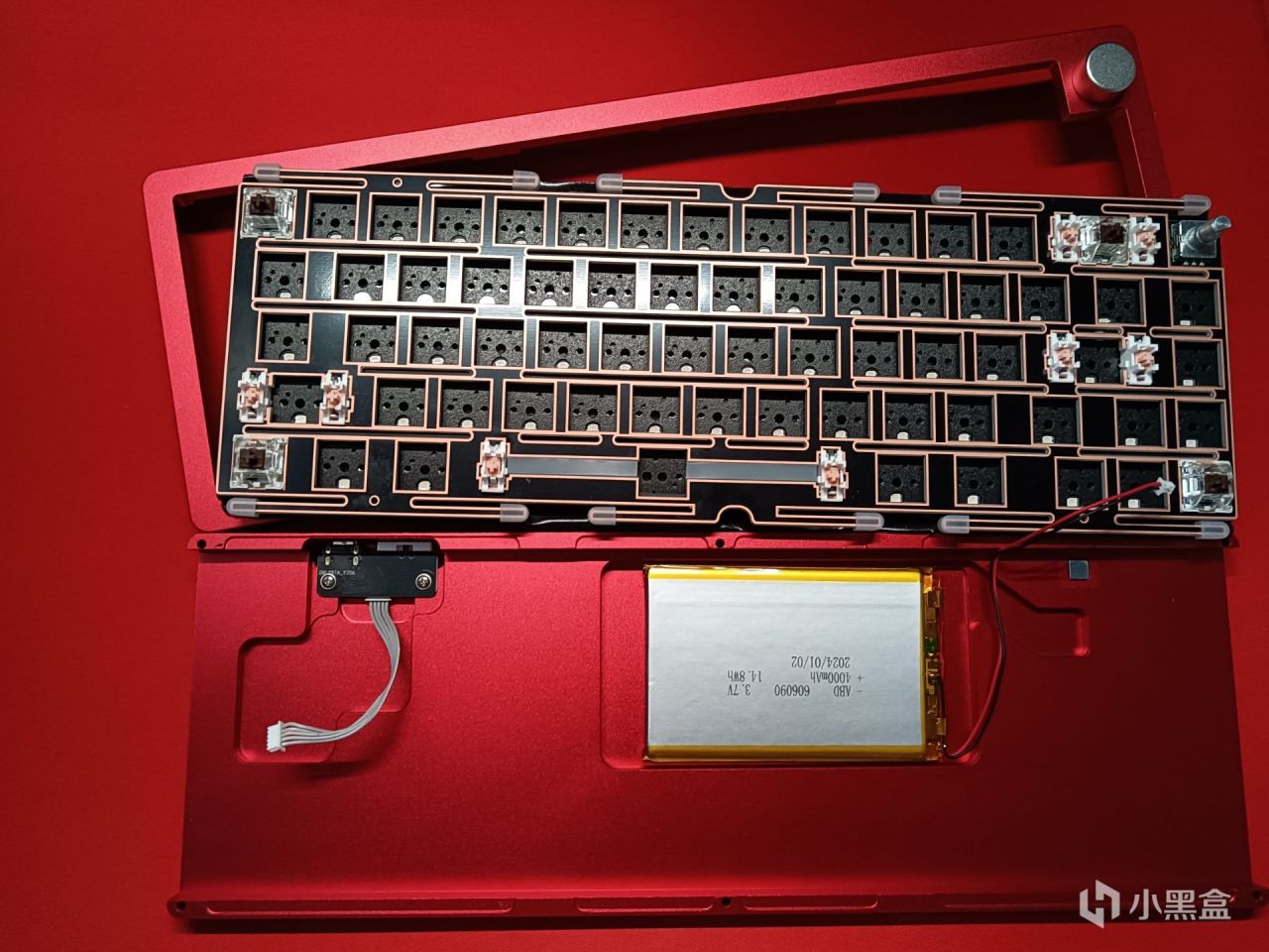 由于赶得比较急,我拿到手的成品是套件+轴体+键帽的形式,大家购买成品的话都是已经安装好的键盘,到手就可以用的,那么既然到手是套件,同时还配了内六角扳手,我肯定是要简单拆解一下的,卸掉后面的六颗螺丝,拔掉旋钮,上盖和底壳就可以完美分开了(记得有排线,一定不要大力出奇迹),拿出内胆,熟悉的Gasket结构,分开之后大家应该就可以看出来了,单键开槽PCB板,上面的轴座是凯华的,同时这把键盘是支持分裂空格和7回的,对应的键位都是做好了的,不过使用这些的话肯定是要换定位板的,这把键盘的定位板是FR4,双面覆铜,横向开槽,也是比较厚实的,4000mah电池容量,下灯位设计,内部填充是poron夹心棉+ixpe轴下垫+pet声优垫+poron轴座棉+底层垫封包,填充很棒,手感和声音都不错。