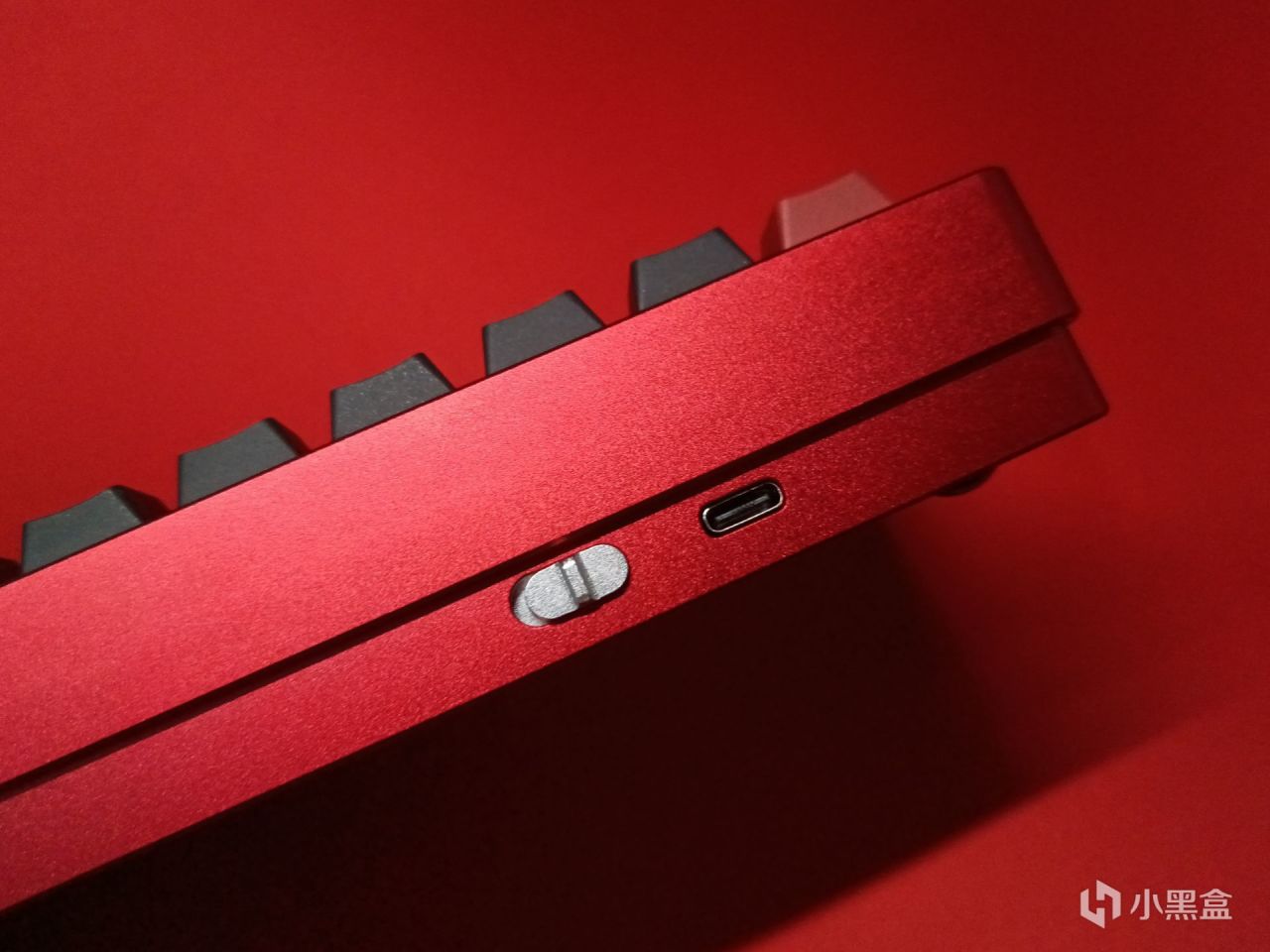Type-C接口以及切换连接方式的拨杆开关布置在了键盘后侧放的左手边,右手边是布置了一个接收器收纳仓,磁吸的,还挺牢固。