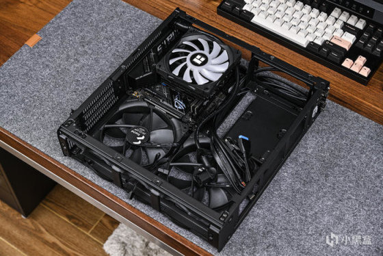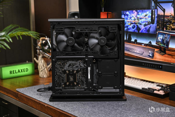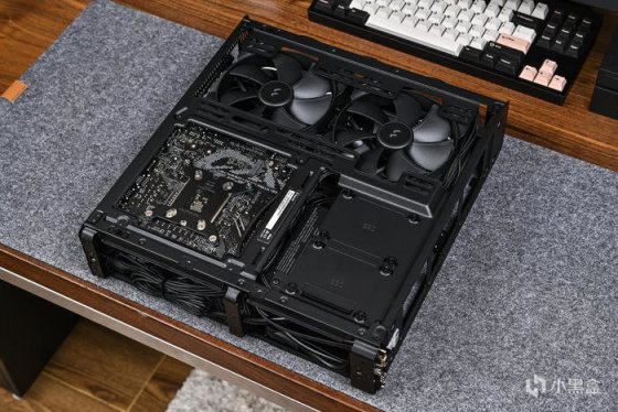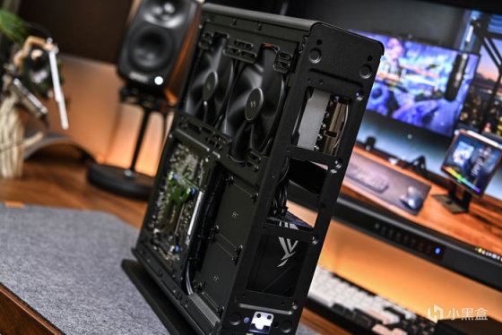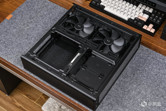 取下主板側板,機箱上下分倉接口,上面爲顯卡安裝位,附贈兩顆 14cm 靜音風扇輔助進風,下方左右分倉,左側爲電源安裝位,支持 SFX/SFX-L電源安裝,右側爲主板安裝位,支持安裝 ITX/DTX 版型。