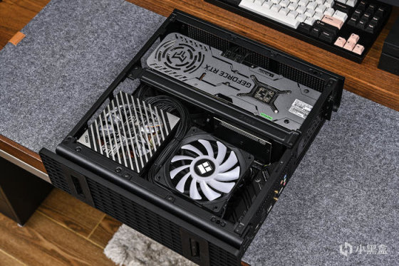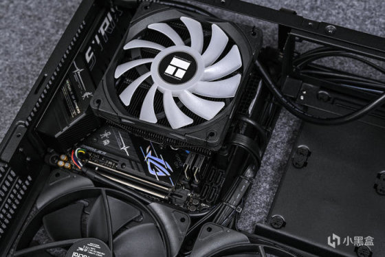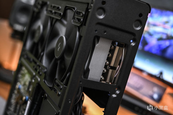 另一側硬件情況展示,上方兩顆 14cm風扇進風輔助顯卡散熱,當然也可以替換爲12cm的。這裏需要注意下,如果保留風扇安裝顯卡,則顯卡厚度最大可達 57mm,如果拆除風扇安裝顯卡,顯卡厚度則擴大到 82mm,長度統一最大爲 335mm。此外這裏還可以安裝 280/240 冷排,增加對 CPU 散熱的功耗上限,但是此時就不可以再安裝顯卡了,具體怎麼選看實際個人硬件需求吧。至於顯卡高度的話也需要講一下,如果頂部安裝三顆 80mm,風扇,則顯卡最高 125mm,頂部不安裝風扇時,顯卡最高達到 137mm。