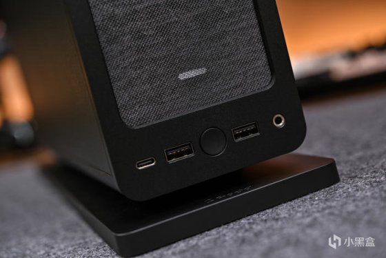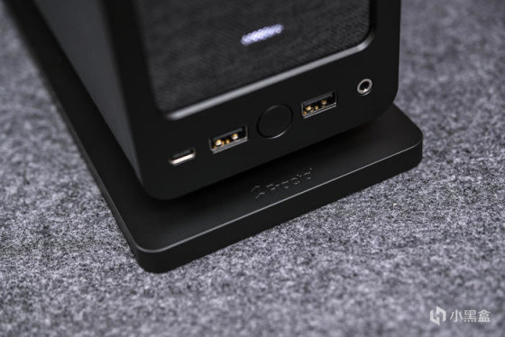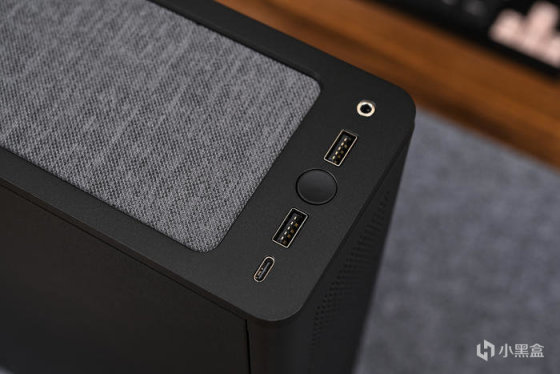 機箱IO在前面板最下方,從左到右分別爲:1個全速 USB 3.1 Gen2 Type-C、1個 USB 3.0 Type-A、開關機鍵、1個 USB 3.0 Type-A、以及 1個 3.5mm 音頻複合接口。