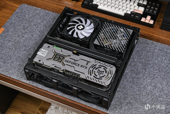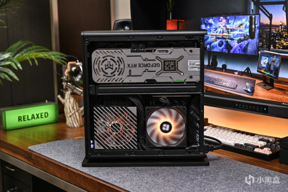 主板側一覽。上下分倉結構,顯卡在二樓,電源和主板一左一右在一樓是鄰居。