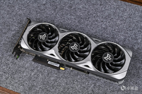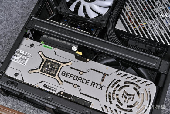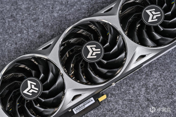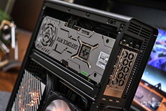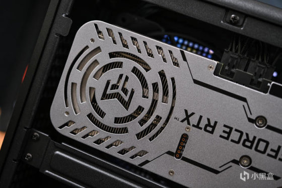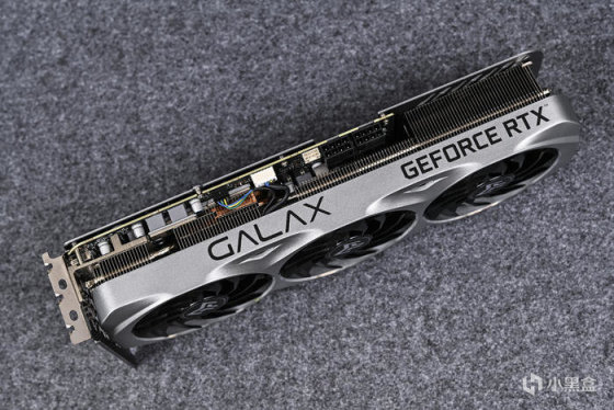 顯卡側面可見顯卡爲三重連鎖設計,安裝顯卡後重量均由機箱承擔,減輕PCB負擔。導風罩中央印有GALAX字樣,右側尾端印有GEFORCE RTX標識。