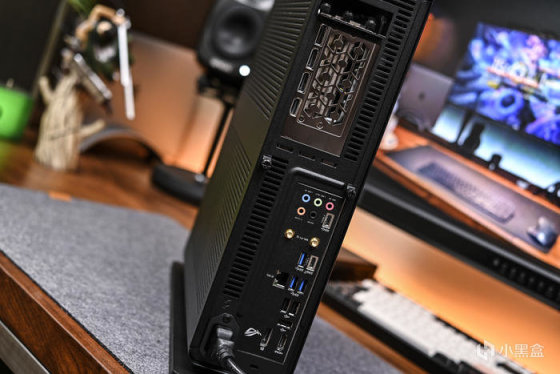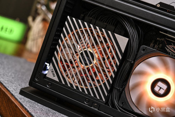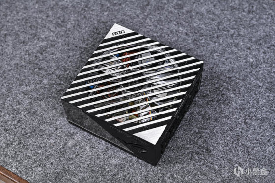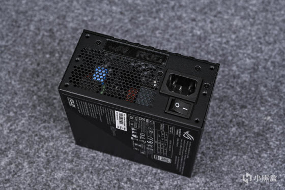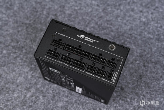 電源一側爲華碩雷神2代電源相同的鏡面飾板設計,但沒有屏幕顯示和RGB光效,右側ROG標識也同樣爲陰刻鏡面設計,相比 雷神2 功能更簡潔一些。