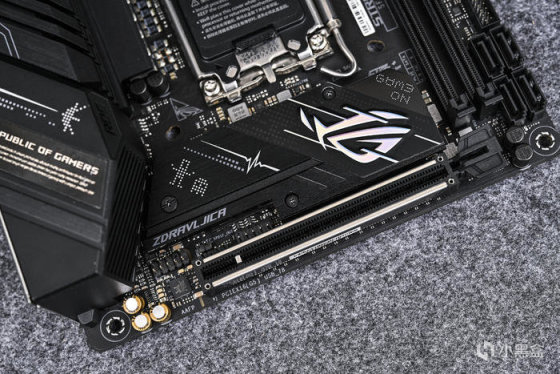 M.2散熱模塊上的ROG敗家之眼,沒有設計燈光。主板M.2 PCIe4.0 M.2插槽支持2260mm和2280mm規格,另一個主板M.2 PCIE4.0接口被放置在主板背面。