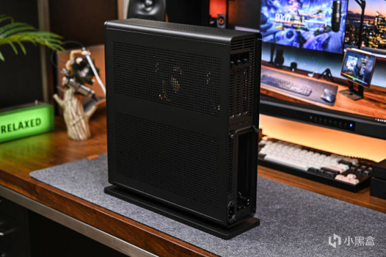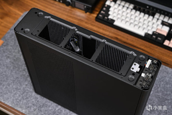 機箱背部一覽。上方爲主板IO接口,右側上方是電源轉接口,下方是3槽位 PCIe插槽擋板,其他區域均做了條形格柵輔助散熱。