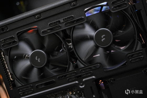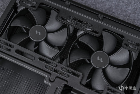 分形工藝自家的 Aspect 14PWM 靜音風扇,最大轉速1700RPM,輔助顯卡進風。這個位置可以安裝 2 顆14cm/12cm風扇,如果保留風扇安裝顯卡,則顯卡厚度最大可達 57mm,如果拆除風扇安裝顯卡,顯卡厚度則擴大到 82mm,長度統一最大爲 335mm。此外這裏還可以安裝 280/240 冷排,增加對 CPU 散熱的功耗上限,但是此時就不可以再安裝顯卡了,具體怎麼選看實際個人硬件需求吧。