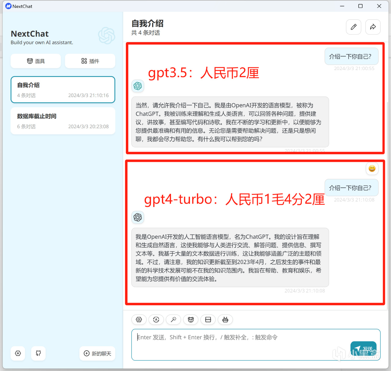 ▼以同样的自我介绍简单对话举例,gpt4-turbo模型的价格要贵几十倍,一问一答就是几毛钱出去了。