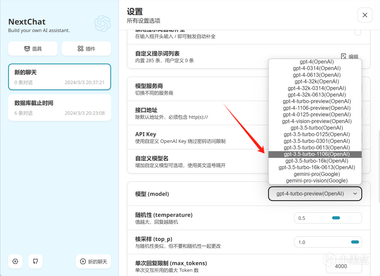 ▼然后在下面的“模型”这里,选择“gpt-3.5-turbo-1106(0penAl)”: