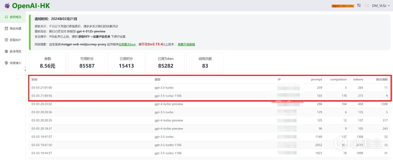 同时,每次对话使用的积分,我们都可以在OpenAI-HK网站的使用概况里看到,用了多少tokens、扣了多少积分都会实时显示,个人感觉还是挺透明的。红圈里就是刚才这段让它自我介绍的对话使用的积分,加起来才用了20积分,合人民币2厘钱: