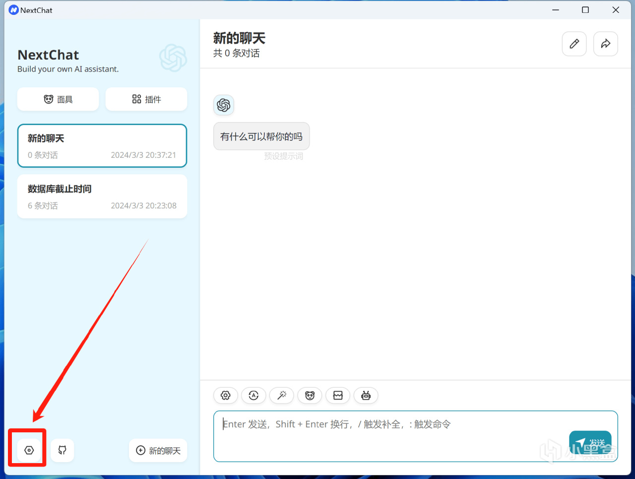 ▼然后回到第一步中我们安装的NextChat软件,在界面中点击下图中的设置按钮: