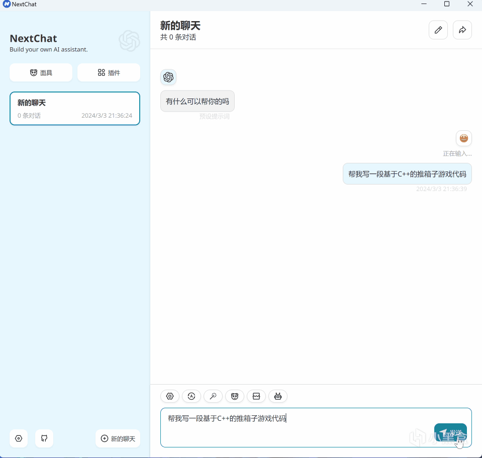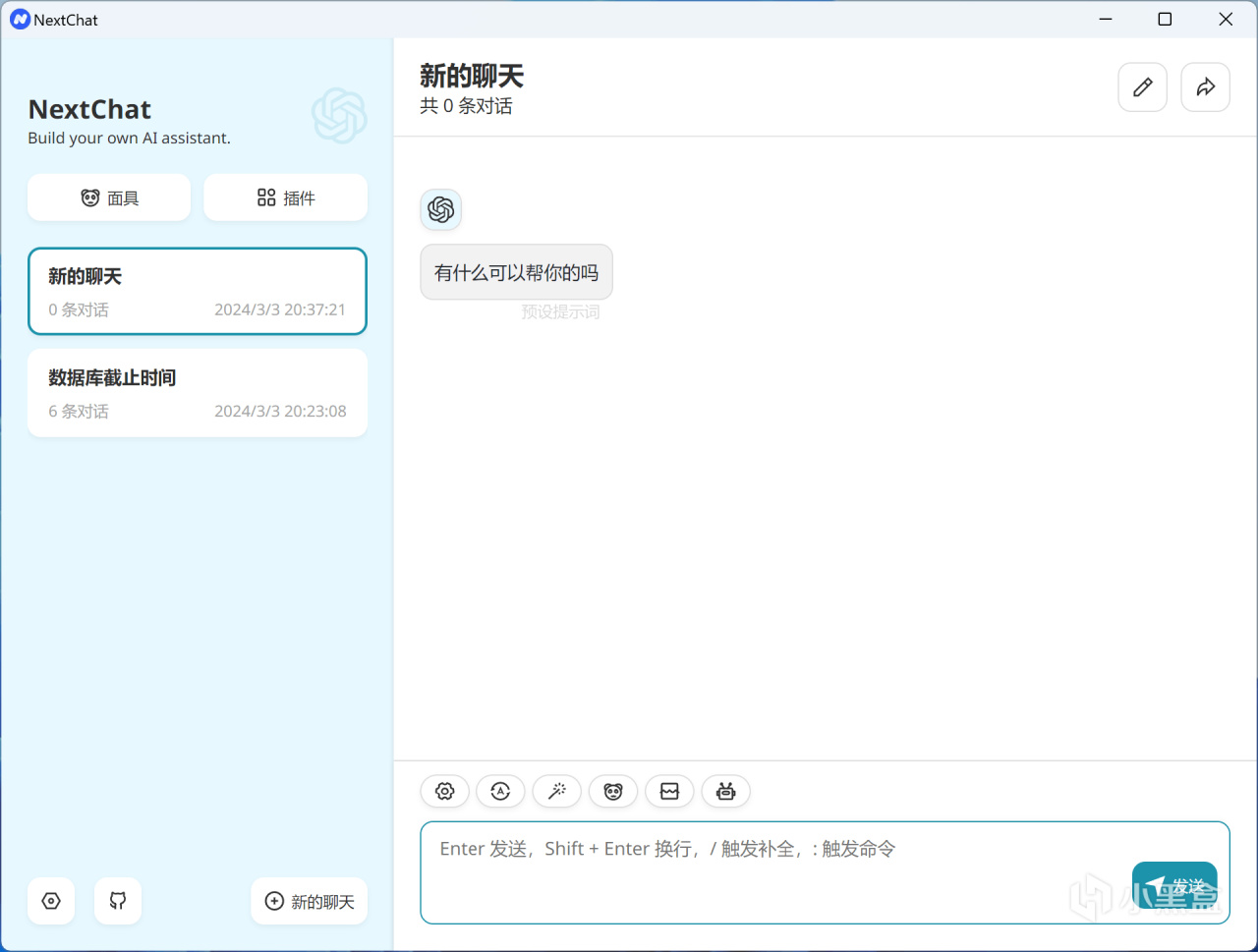▼安装完成后,打开NextChat,即可看到界面了,真的是很不错的。