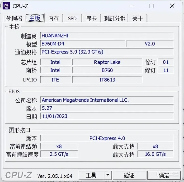 主板信息见上图。从中看得出,华南金牌B760M-D4虽然价格便宜,但性能并不算拉垮。