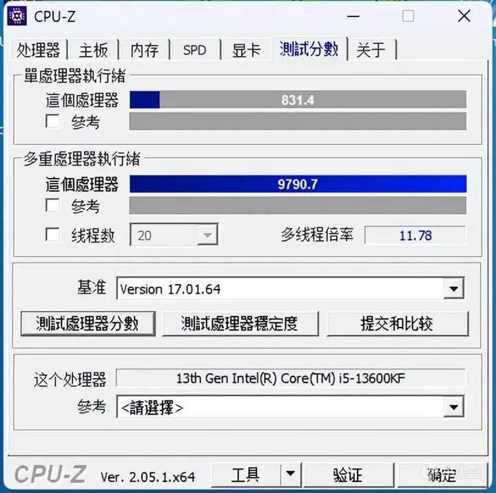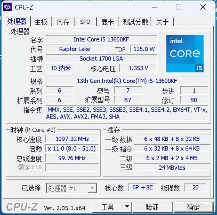 使用CPU-Z,测试13600KF CPU,14核心,20线程,功率125W。