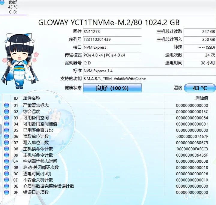 使用CrystalDisklnfo测试SSD,以前有使用过,通电次数24次,38小时通电时长健康状态良好,温度43度,没有单独上散热马甲。