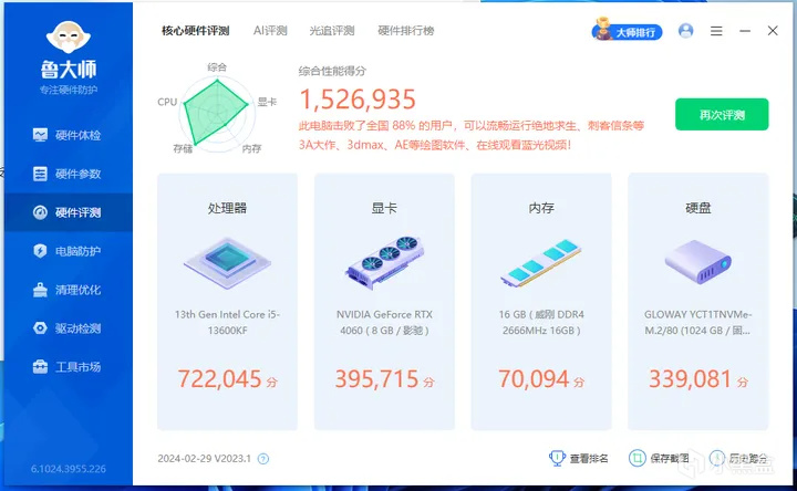 这是娱乐大师的跑分,150万的分值,对于日常主要用于办公和偶尔游戏的我来讲,是完全够用的了。内存只上了一根,另一根还要在老电脑上发挥作用,就没安装。