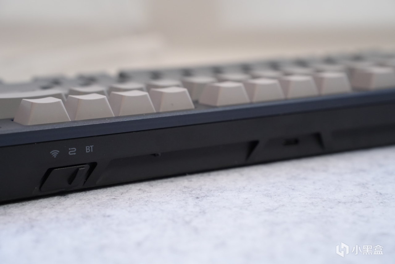 键盘的侧边从左往右分别是键盘的模式切换按键,充电口,以及键盘的2.4g收纳仓,但是这个还是十分的熟悉好像是在那里见过,好像是某魔啊。