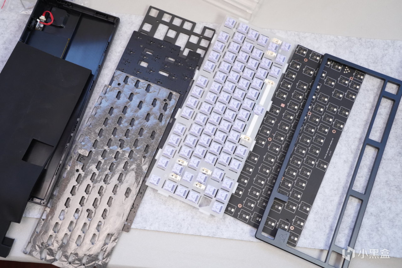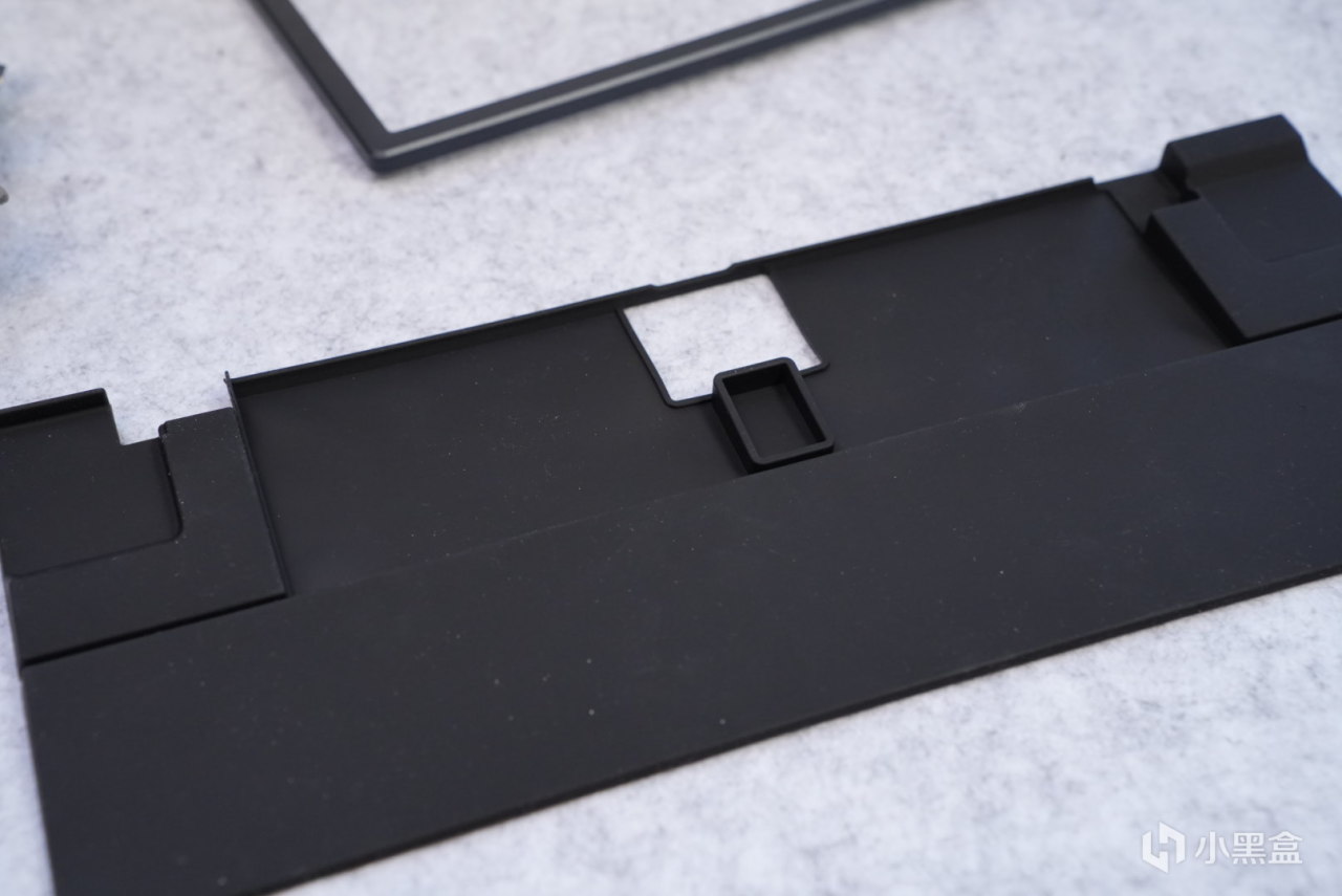底部采用了一张开模的硅胶垫底棉,这里就有人好说了,为什么不用poron材质的捏,这是因为底部凹凸不平,如果用整张的poron夹心棉就会导致会有一些空隙,但是如果分开切割,一是成本提升,二是切割会有一些误差,有点麻烦。