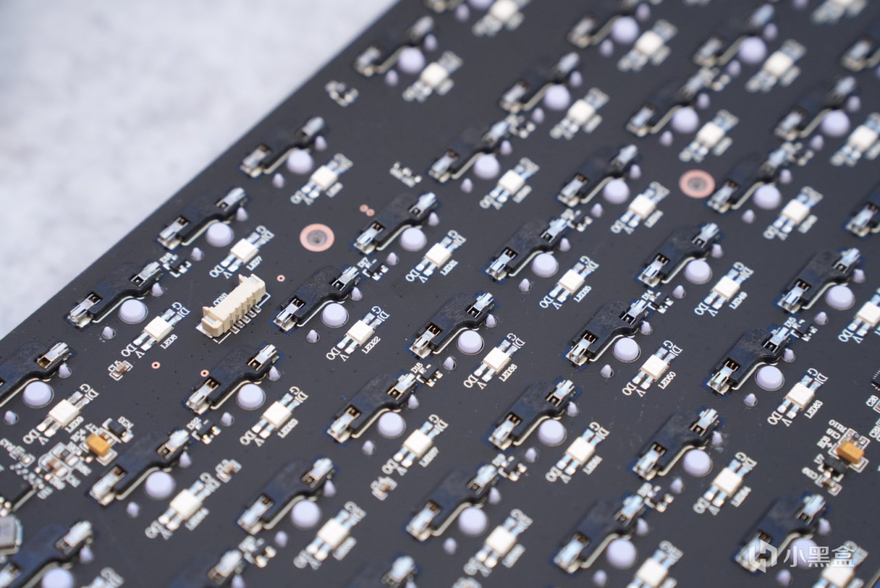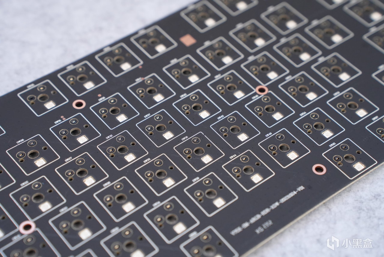 pcb这里没有进行开槽的设计,我想着是为了售后的稳定性以及键盘本身定位电竞,也是为了更明确的触底反馈,键盘整体采用下灯位的设计,加上我这手里的侧刻键帽,灯光效果很舒服。pcb背面采用的是凯华的热插拔轴座