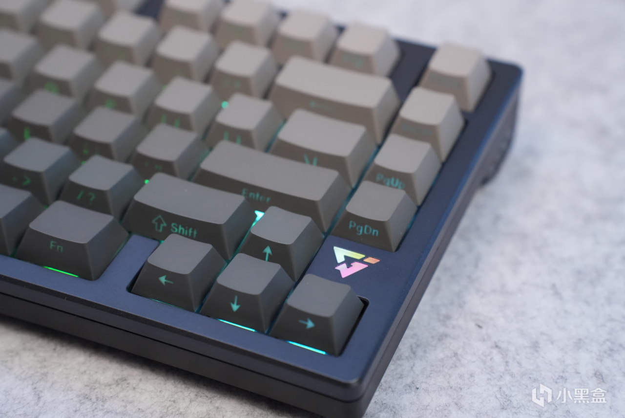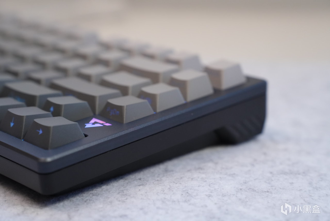 键盘右侧有一个氛围灯,同时也是一个指示灯,2.4g以及蓝牙的连接模式下会分别闪烁绿灯以及蓝灯,提示对应的连接模式,连接上之后会变成正常的氛围灯,logo采用的是他家自己的logo,感觉还OK