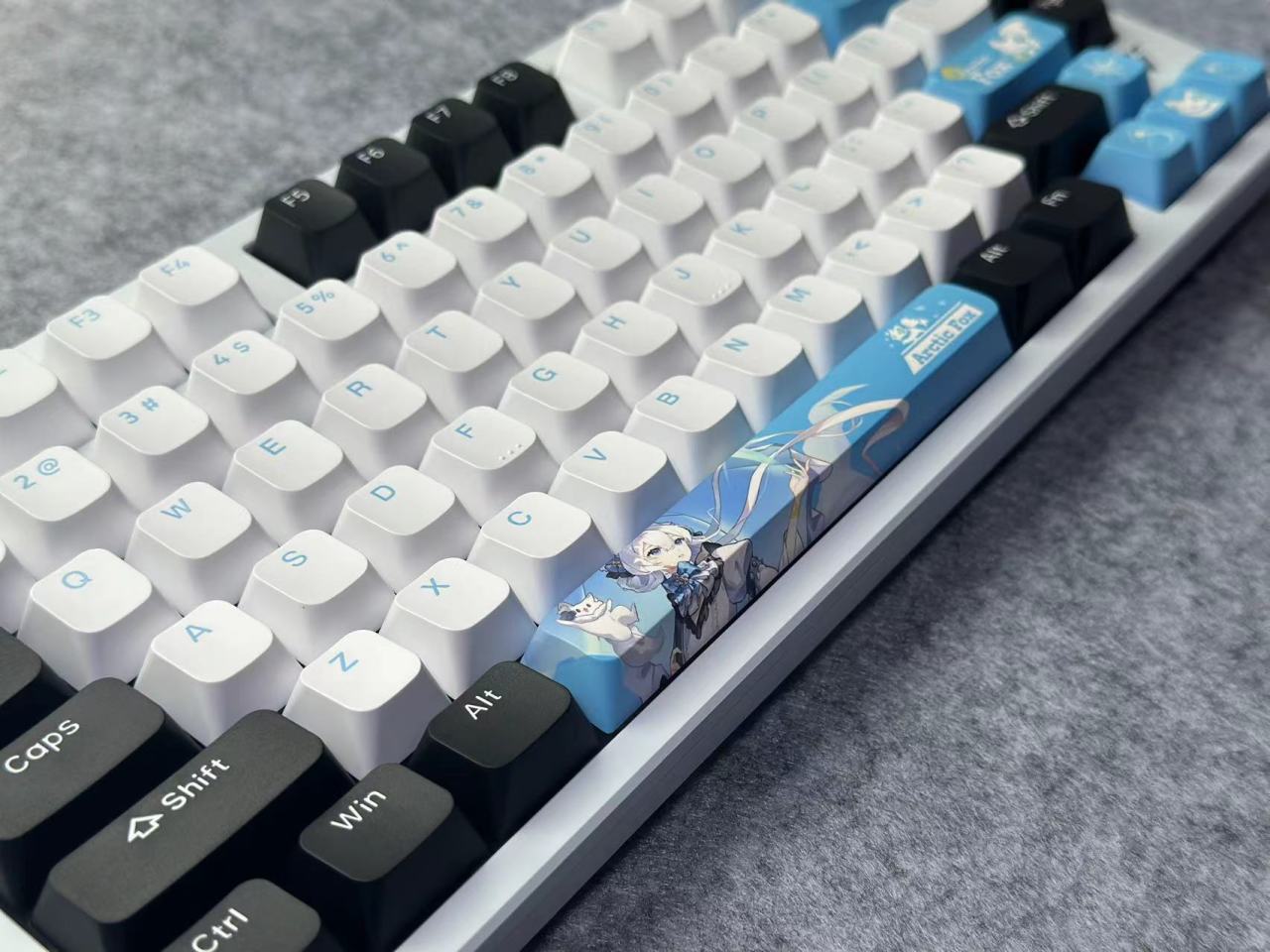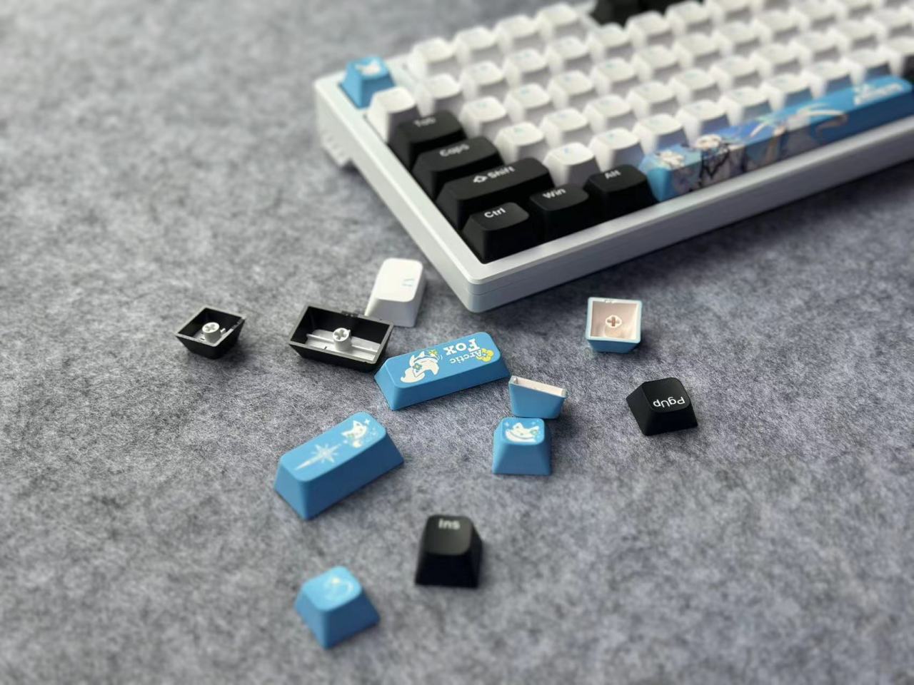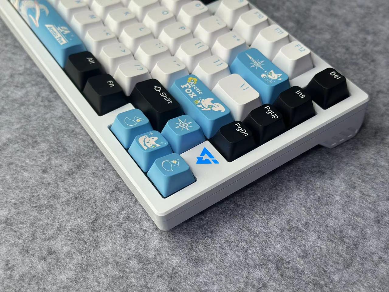 V75X極地限定版的鍵帽是採用KOP高度,PBT材質。本次鍵帽也圍繞極地狐的人物IP來進行設計,整體的鍵帽做工細節也是非常到位,沒有發現色差,毛刺這些現象。