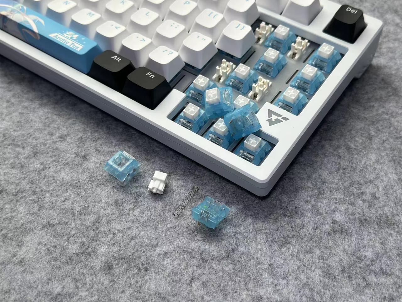我手上這把V75X爲極地狐軸,該軸體爲一款段落軸。該軸上下蓋採用透藍PC材質且帶有導光柱,軸芯採用pom材質。整個軸體潤滑情況:在軌道,小爪,彈簧,底殼限位柱都是有明顯潤滑情況。