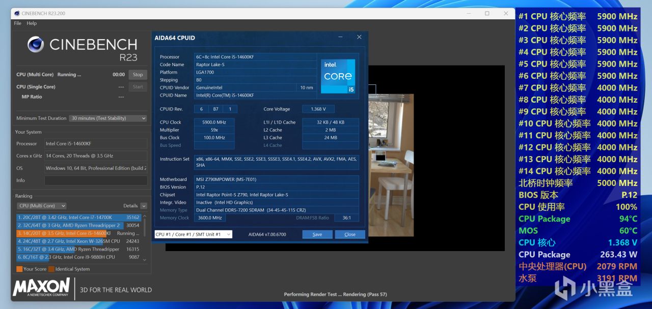 烤机方面,这颗CPU超频后能通过三十分钟的R23多核测试,CPU Package温度最高为94℃,CPU Package功耗为263W左右,此时360水冷就是全力运行的状态了,也说明玩14600KF超频高端风冷也是未必能满足的,主板MOS温度来到60℃,显然对于Z790MPOWER来说还是轻松,个人觉得它搭配14700K/KF超频也是无压力的,当然CPU散热性能也要跟得上。