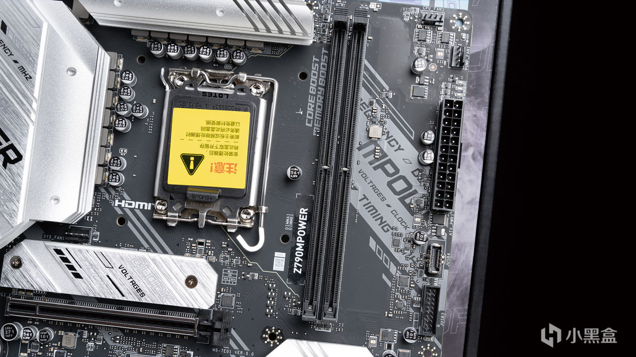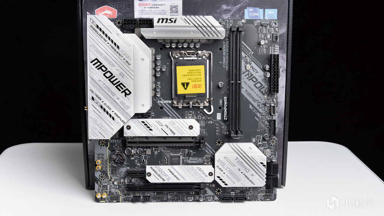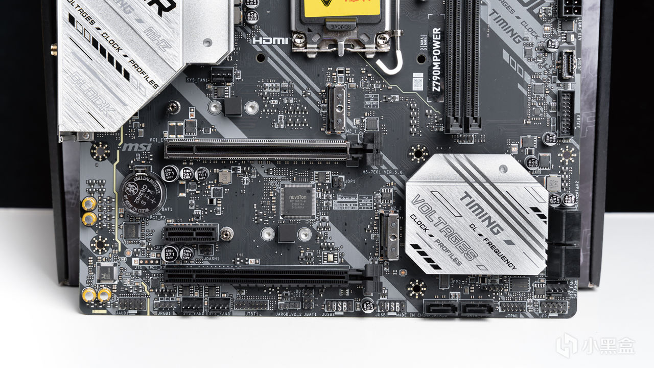 Z790MPOWER外观方面看上去就很熟悉,和B760M迫击炮系列多少是相似的——采用规模相当的银白色散热盔甲覆盖,不同的是Z790MPOWER除了名称以外,还有不少超频相关的术语覆盖在盔甲表面,比如“VOLTAGES(电压)”、“TIMING(时序)”、“FREQUENCY(频率)”,对于超频玩家仪式感简直拉满了。