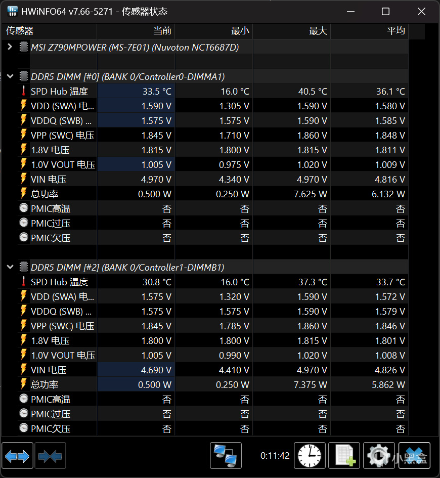在烤机过程中,硬核也使用辅助风扇直吹内存条,迎风的B通道内存最高温度只有37℃,而A通道内存也只有40℃,如果没有风扇辅助,内存温度至少还要高10℃以上,也不好通过烤机测试,大概率会报错。