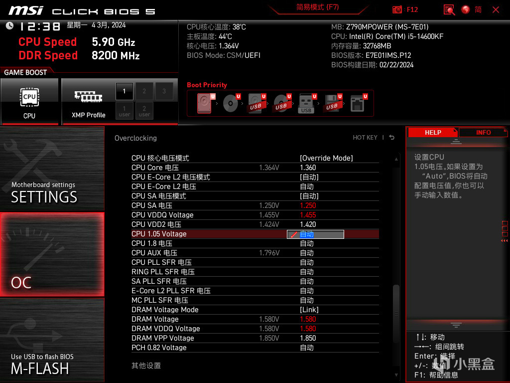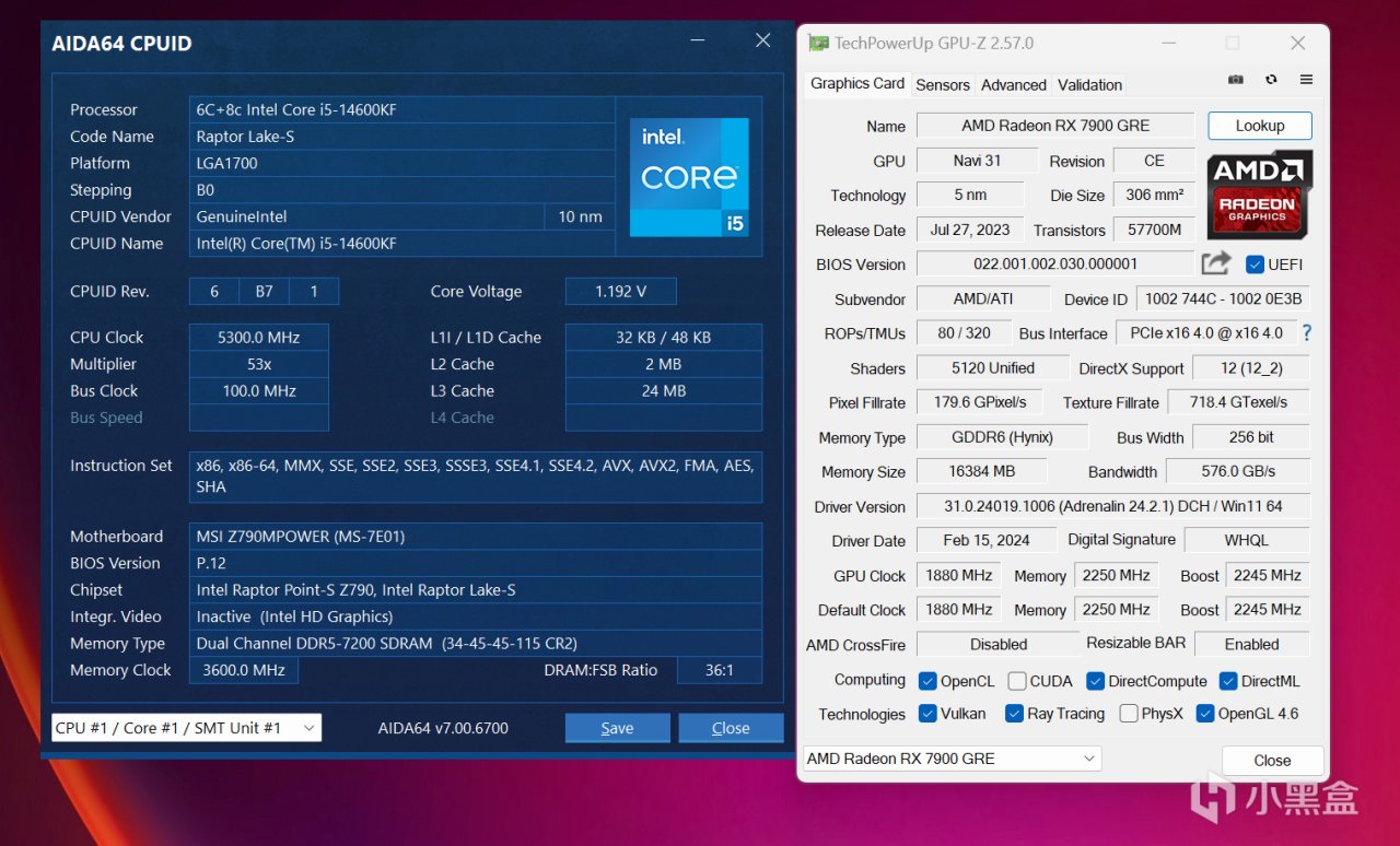 为了配合Z790MPOWER进行超频测试,硬核这次特意挑了一颗核心、IMC体质尚可的Core i5 14600KF,属于中雕左右的水平,而显卡使用的AMD RX 7900 GRE,主要作用是配合超频前后的游戏测试对比,操作系统是Windows 11 23H2,主板BIOS使用7E01vP12 Beta版本,全程都是裸平台测试,室温大致15℃左右。