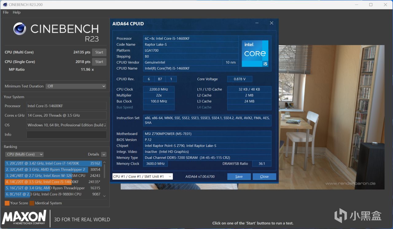 14600KF默认P核心5.3GHz+E核心4.0GHz,CINEBENCH R23多核分数为24135 pts,单核分数为2018 pts