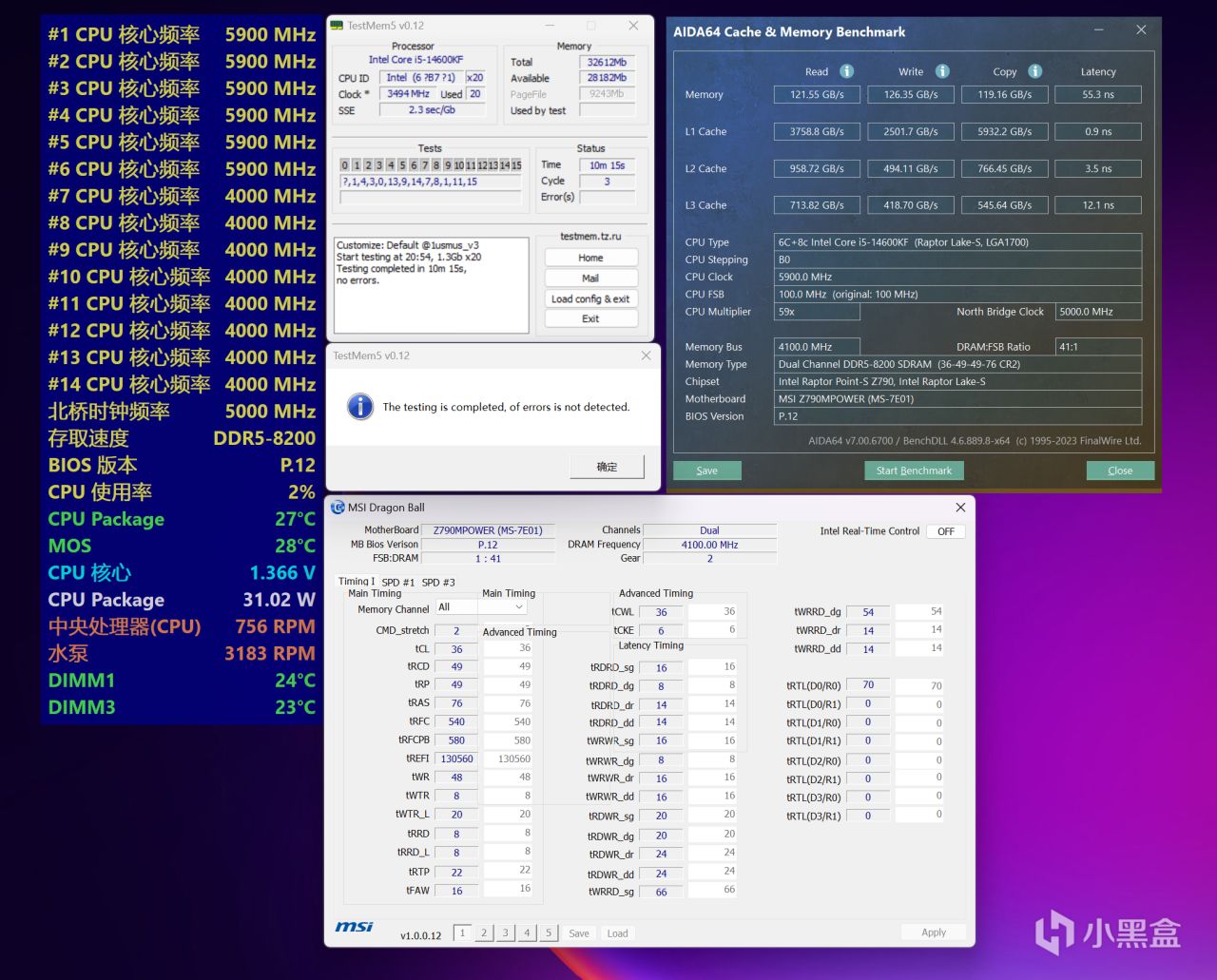 达成的DDR5-8200MHz频率时序设置为CL-36-49-49-76,小参也有相关调节,配合14600K的P核心超频5.0GHz+Ring超频5.0GHz,这种状态下是能通过TestMem5 1usmus_V3配置内存烤机项目的。超频后AIDA64的内存效能,读取、写入、复制三项已经达到120 GB/s的水平,提升非常明显,内存延迟也降至55.3ns,非常给力。